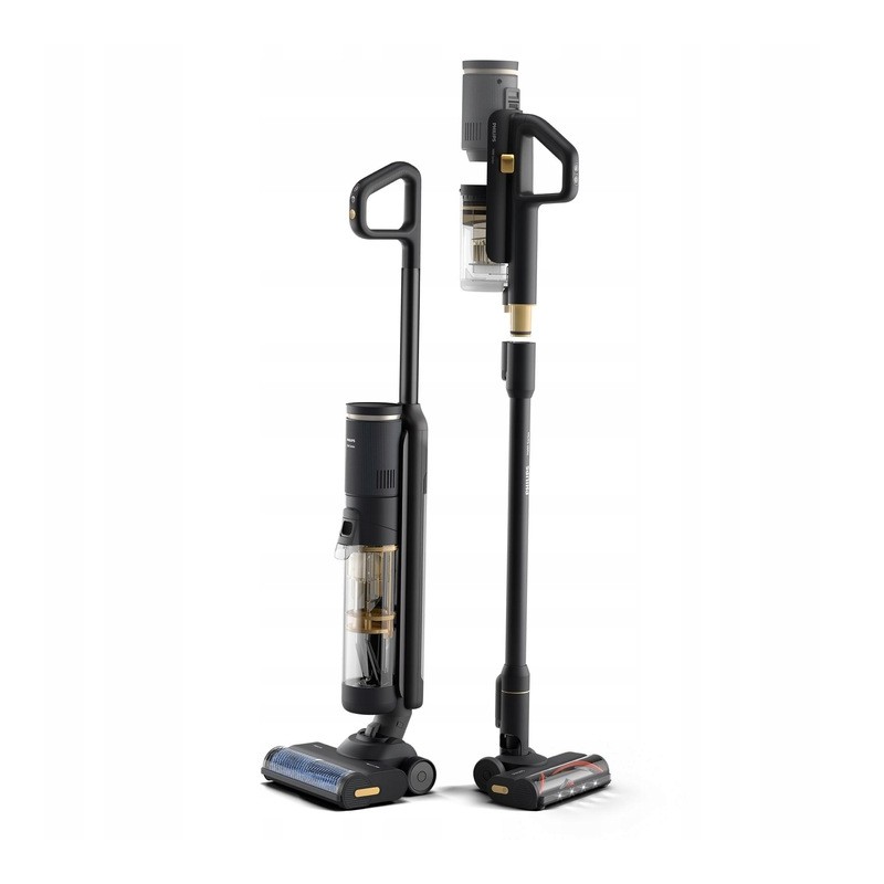 Odkurzacz bezprzewodowy Philips AquaTrio Xw7264/11 z funkcją aktywnego mycia Philips AquaTrio Xw7264/11 to zaawansowany odkurzacz bezprzewodowy, który łączy w sobie funkcje odkurzania i aktywnego mycia podłóg. Dzięki technologii PowerCyclone Aqua oraz opatentowanym szczotkom AquaSpin, urządzenie skutecznie usuwa kurz, brud, plamy i płyny za jednym pociągnięciem. Automatyczny cykl samoczyszczenia zapewnia higienę i gotowość do kolejnego użycia bez konieczności ręcznego czyszczenia szczotek. Korzyści: - Odkurzanie i aktywne mycie jednocześnie - Opatentowane szczotki wysokoobrotowe: AquaSpin 2500 obr./min - Automatyczny cykl samoczyszczenia - Mycie podłóg wyłącznie czystą wodą dzięki technologii PowerCyclone Aqua - Trzy specjalne tryby czyszczenia dostosowane do różnych potrzeb - Czas pracy do 45 minut w trybie samego odkurzania - Delikatne dla twardych podłóg dzięki miękkim szczotkom z mikrofibry - Nasadka z podświetleniem LED ujawniająca ukryty brud Wszechstronność i efektywność Philips AquaTrio Xw7264/11 oferuje trzy tryby pracy: odkurzanie i aktywne mycie, samo odkurzanie oraz tryb ręczny, umożliwiając dostosowanie działania do różnych powierzchni i potrzeb użytkownika. Opatentowane szczotki AquaSpin obracają się z prędkością 2500 obr./min, co pozwala na skuteczne usuwanie nawet trudnych zabrudzeń. Dzięki technologii PowerCyclone Aqua, urządzenie myje podłogi wyłącznie czystą wodą, oddzielając brud i brudną wodę od czystej. Higiena i łatwość użytkowania Automatyczny cykl samoczyszczenia eliminuje konieczność ręcznego czyszczenia szczotek po każdym użyciu, co zapewnia higienę i wygodę. Miękkie szczotki z mikrofibry są delikatne dla twardych podłóg, jednocześnie skutecznie usuwając zabrudzenia. Nasadka z podświetleniem LED ujawnia ukryty kurz i brud, ułatwiając dokładne sprzątanie nawet w słabo oświetlonych miejscach. Wydajność i ergonomia Odkurzacz wyposażony jest w litowo-jonowy akumulator o napięciu 21,6 V, który zapewnia do 45 minut pracy w trybie samego odkurzania oraz do 25 minut w trybie odkurzania i aktywnego mycia. Pojemność zbiornika na czystą wodę wynosi 450 ml, a na brudną wodę 420 ml, co pozwala na efektywne sprzątanie bez częstego opróżniania. Urządzenie waży 4,5 kg, co w połączeniu z ergonomicznym designem i elastycznością w zakresie od 90 do 180 stopni umożliwia łatwe manewrowanie nawet w trudno dostępnych miejscach.
