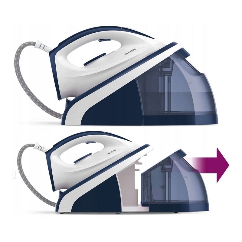 • Odłączany zbiornik wody o poj. 1,4 L - Zbiornik wody można łatwo wyjąć i napełnić pod kranem. Duży otwór wlewowy umożliwia szybkie napełnianie. Dzięki zbiornikowi wody o pojemności 1,4 l możesz prasować nieprzerwanie przez 2 godziny bez konieczności ponownego napełniania.